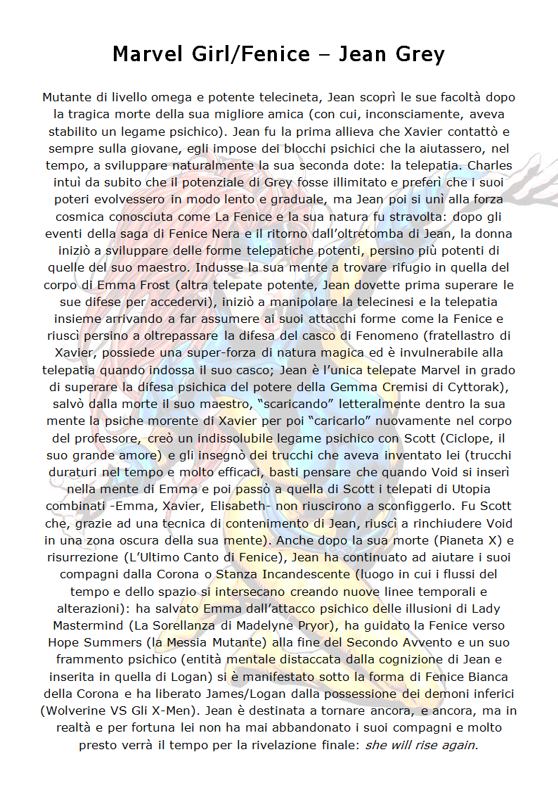 Mutante alfa (ovvero mutante che potrebbe esprimere il proprio potenziale tendendo all’omega), mentore e fondatore degli X-Men, Xavier è un uomo con un passato non del tutto limpido e ricco di molti punti oscuri. Per anni è stato il telepate più potente dell’universo Marvel e la sua destrezza nelle arti psichiche non era seconda a nessuno: anche se a lungo è stato paralizzato ciò non gli ha impedito di partecipare attivamente alle battaglie contro i nemici dell’umanità e i mutanti crudeli. Xavier è la causa, però, di alcune malefatte che hanno provocato distruzione (Onslaught, mente di Xavier fusa con quella di Magneto) e dolori (ha celato a Scott e Alex la presenza di un terzo fratello Summers per anni e ha mandato a morte il secondo gruppo di X-Men, senza una preparazione adeguata). Xavier ha sempre esteso le sue abilità al di là della semplice telepatia (lettura del pensiero), arrivando a provocare dolore (o morte) con un solo pensiero, alterando la percezione umana con illusioni o creando difese psichiche impenetrabili. Egli è, inoltre, colui che ha generato dei blocchi psichici nella mente di Jean Grey quando si rese conto che la ragazza aveva un potenziale illimitato (omega) e difficilmente gestibile. Col tempo, Jean ha superato di gran lunga Xavier, estendendo la sua natura psichica a livelli inimmaginabili.