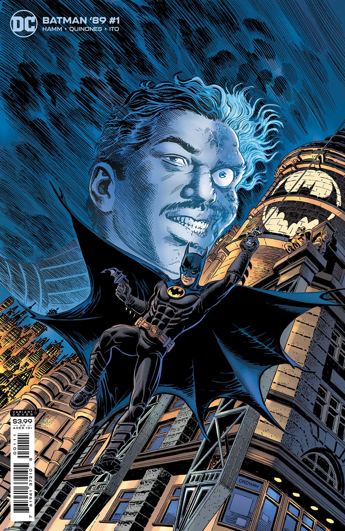 Step back into the Gotham of Tim Burton's seminal classic Batman movies! Batman '89 brings in screenwriter Sam Hamm (Batman, Batman Returns) and artist Joe Quinones (Dial H for Hero) to pull on a number of threads left dangling by the prolific director. Gotham becomes torn in two as citizens dressed as Batman and The Joker duke it out in the streets. As D.A. Harvey Dent tries to keep the city together, he targets the one problem tearing it apart: BATMAN! And he'll get Bruce Wayne's help in taking down the Dark Knight!